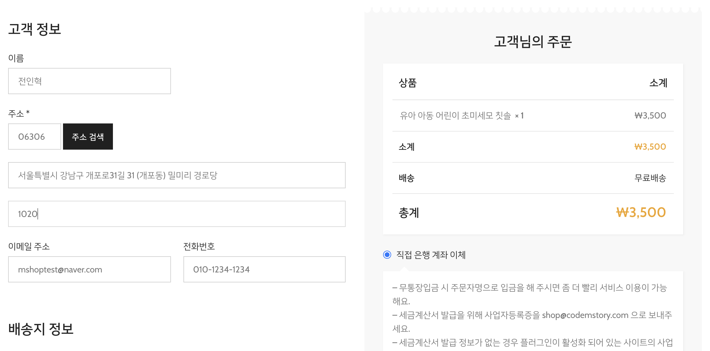 수량 선택 후 바로구매 버튼을 클릭하면, 해당 상품을 구매할 수 있는 결제 페이지로 이동됩니다.