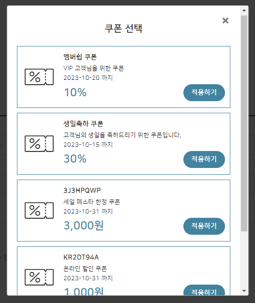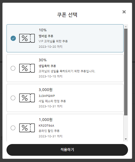 use_toggle– 아코디언 사용여부를 지정합니다. 기본값은no입니다.toggle_default_state– 아코디언 기본 상태를 지정합니다. 기본값은close입니다.toggle_target– 아코디언을 실행할 태그를 지정합니다. 입력하지 않을 경우 쿠폰 / 포인트 위젯으로 자동 지정됩니다.summary– 아코디언에 요약정보를 입력합니다. 지정하지 않을 경우 표시되지 않습니다.use_coupon_input–template타입이mscp-card,mscp-select,mscp-popup-table,mscp-popup-radio일 때 사용합니다. 쿠폰 수동 입력 가능 여부를 지정하며, 사용할 경우 yes를 입력합니다. no로 지정하는 경우 쿠폰을 직접 입력할 수 없으며 목록에서 선택해야만 합니다. 기본값은no입니다.column–template타입이mscp-card일 때 사용합니다. 쿠폰 리스트의 컬럼수를 지정합니다. 기본값은1입니다.
