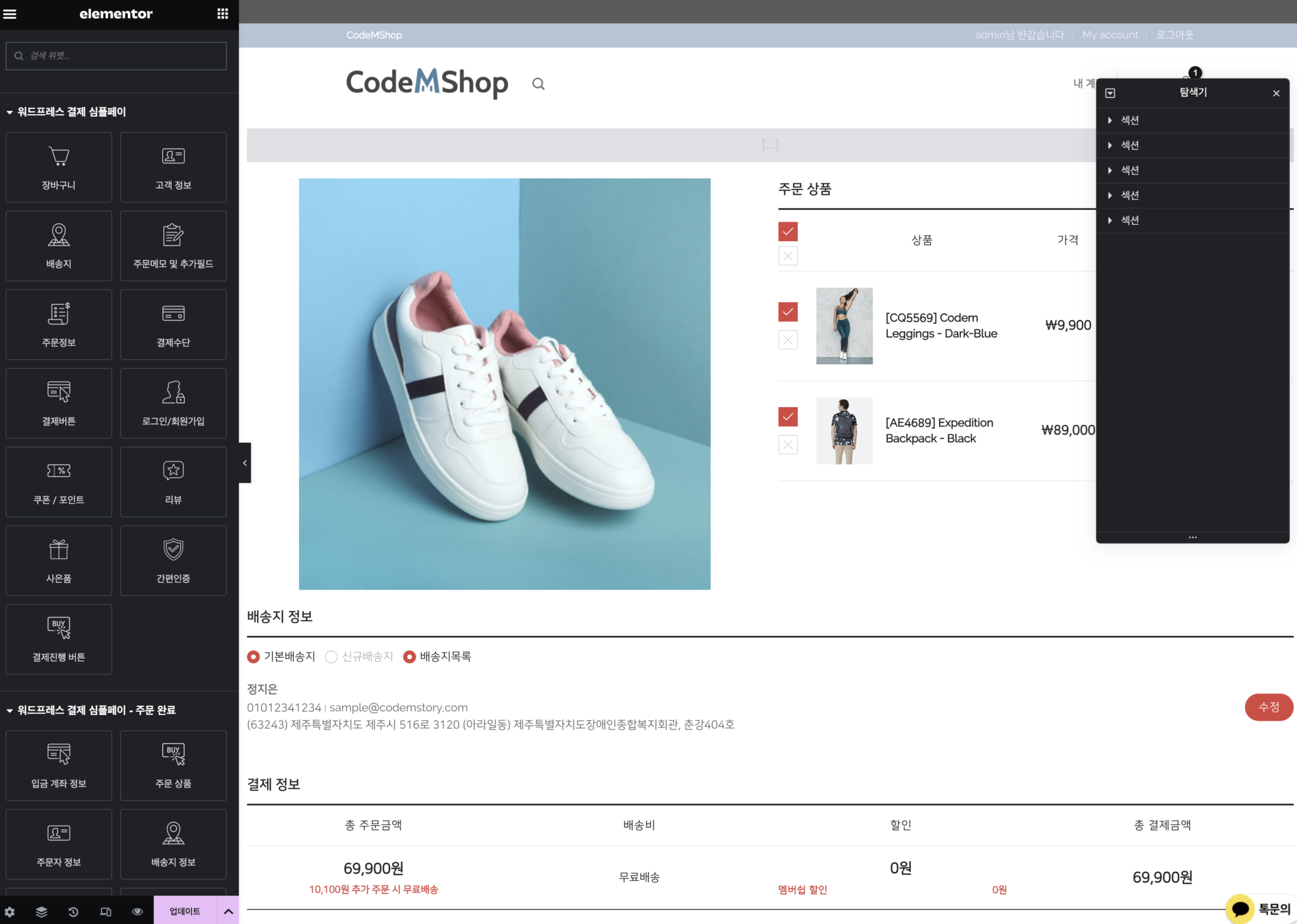 페이지에 장바구니, 결제수단 등 위젯을 추가합니다.