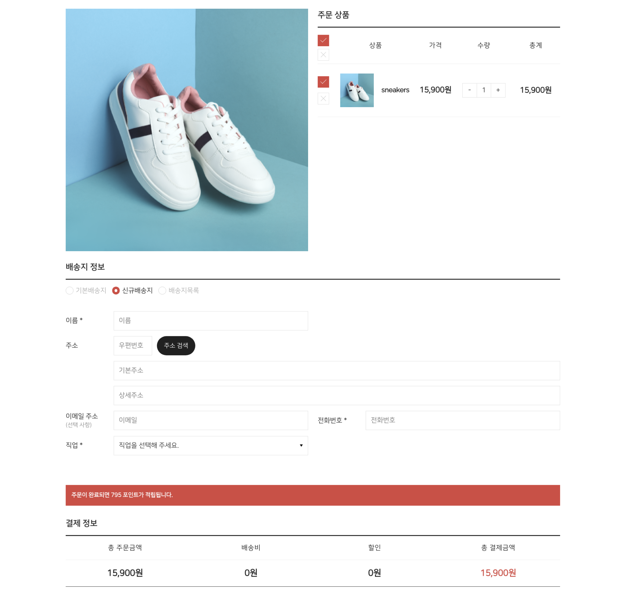 장바구니, 청구지 주소(고객주소), 결제내역, 결제수단 위젯은 필수 위젯이므로 반드시 추가해야합니다.