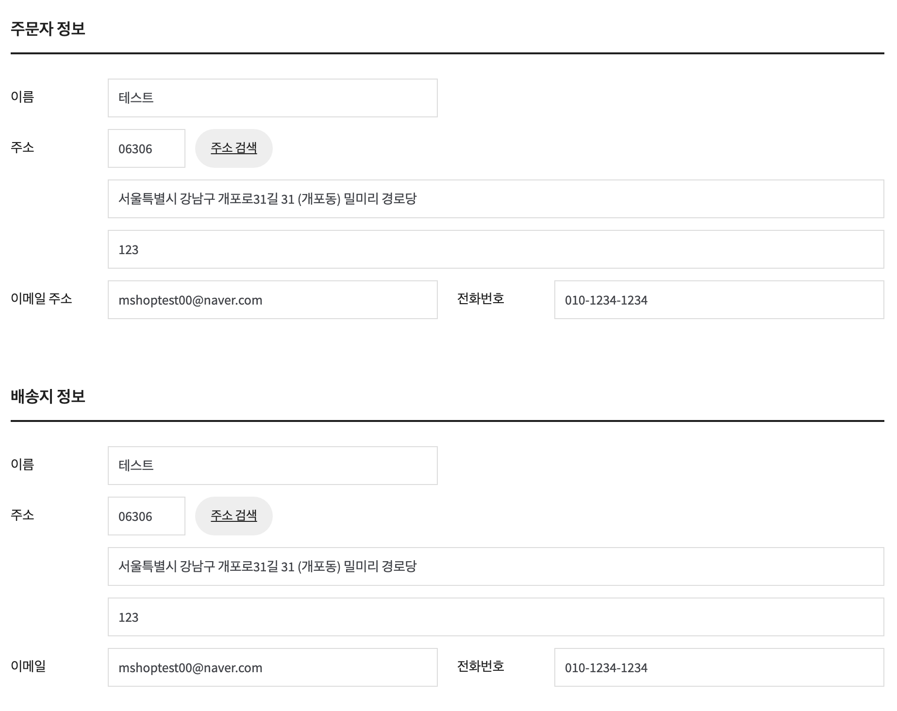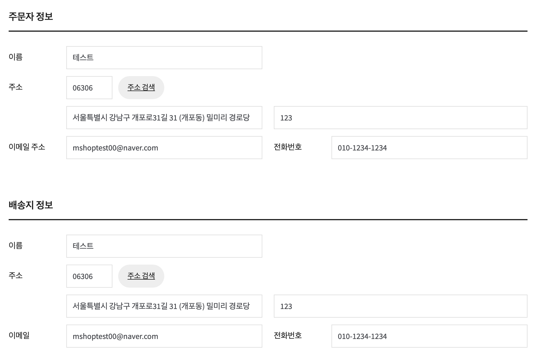 title– 배송지 주소 제목을 지정합니다. 기본값은배송지 정보입니다.template– 배송지 주소 템플릿을 지정하며, 기본값은type-a입니다.type-a– 배송지 주소가 나타납니다.