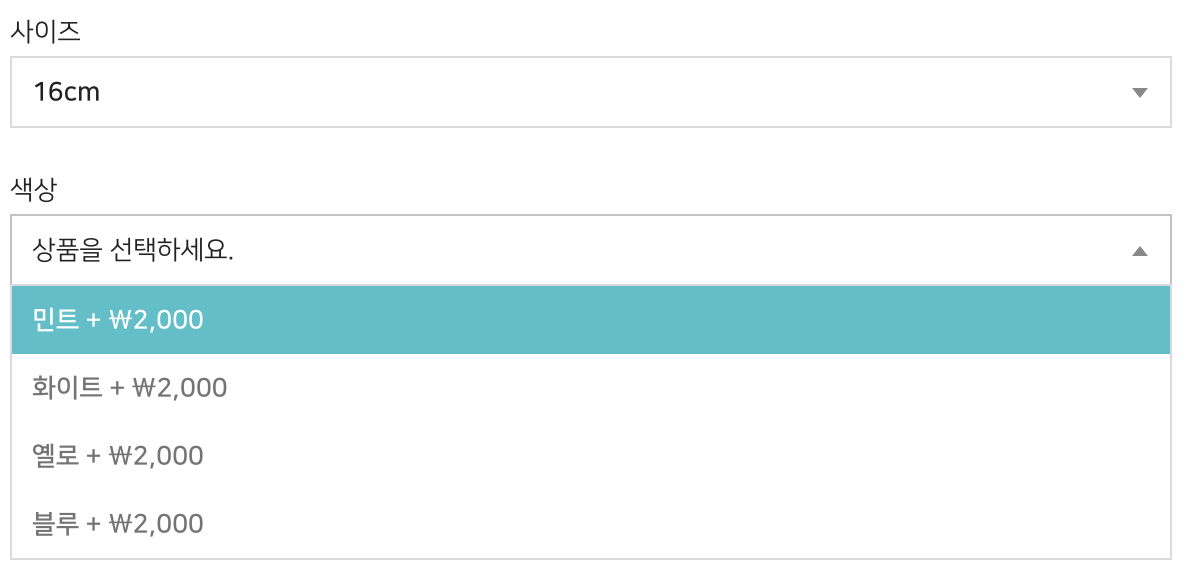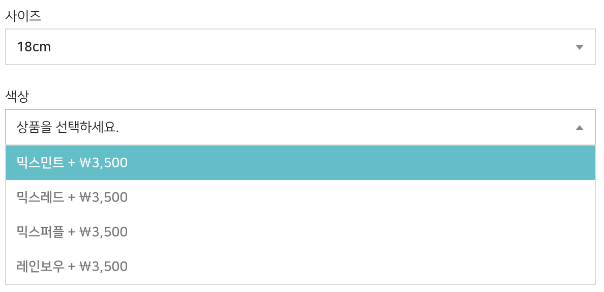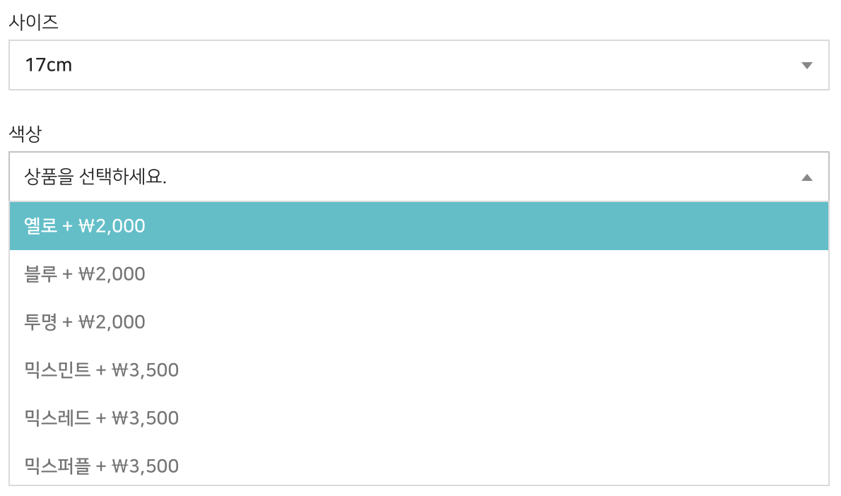 (상품 옵션이 2개 이상일 때) A 옵션에서는 abc, B 옵션에서는 XYZ 이 나타나도록 하고 싶은 경우, 의존성 설정 기능을 이용합니다.
