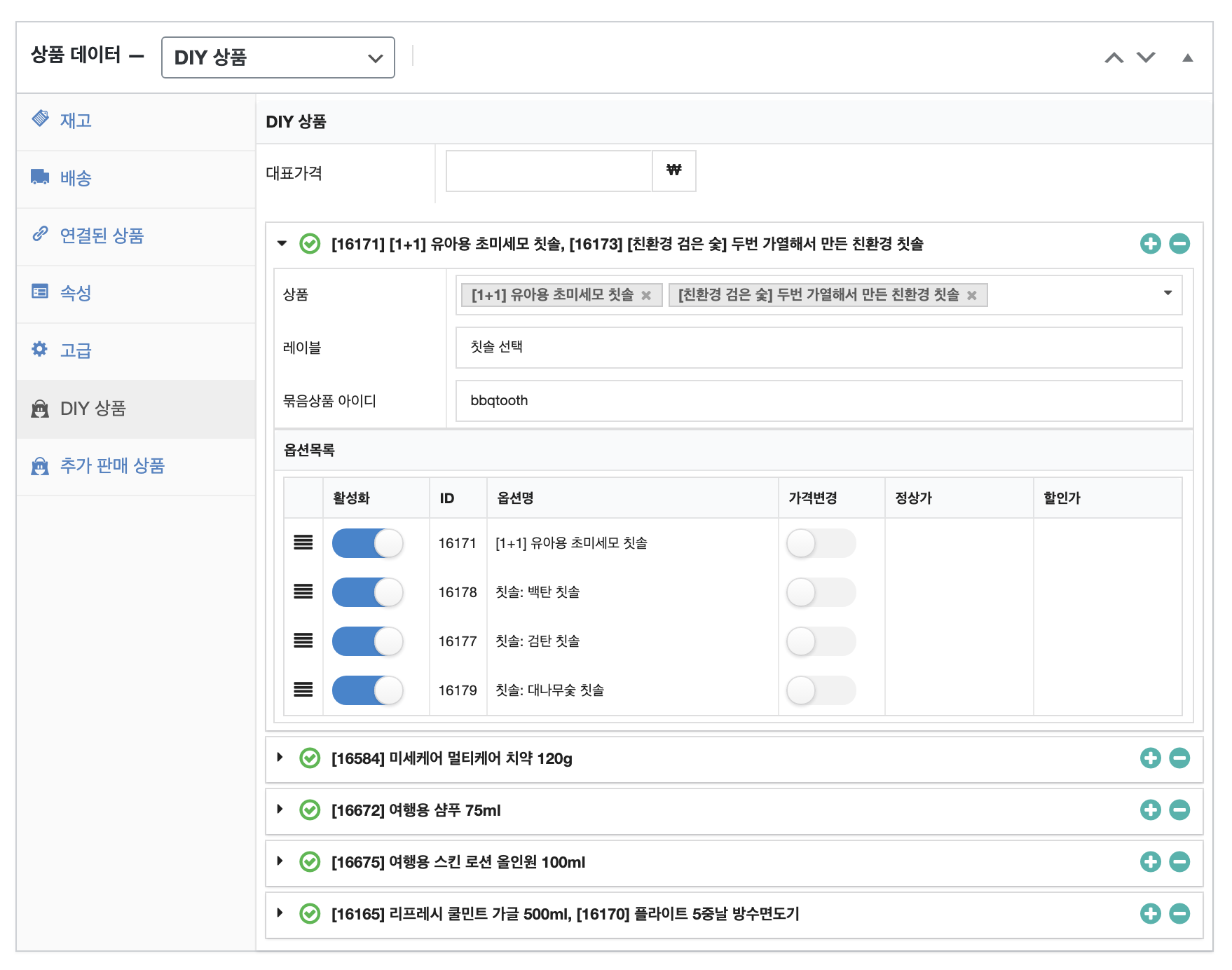 DIY 상품은 기존 상품을 조합하는 개념이기 때문에, 상품 정보 및 재고 정보가 연동됩니다.