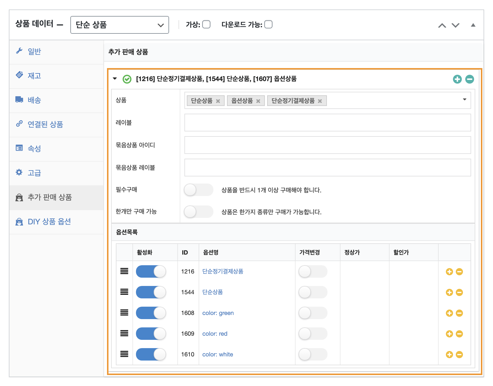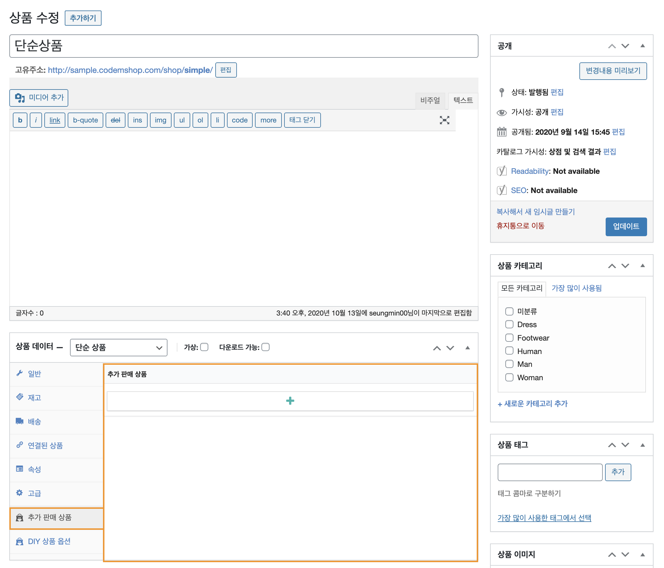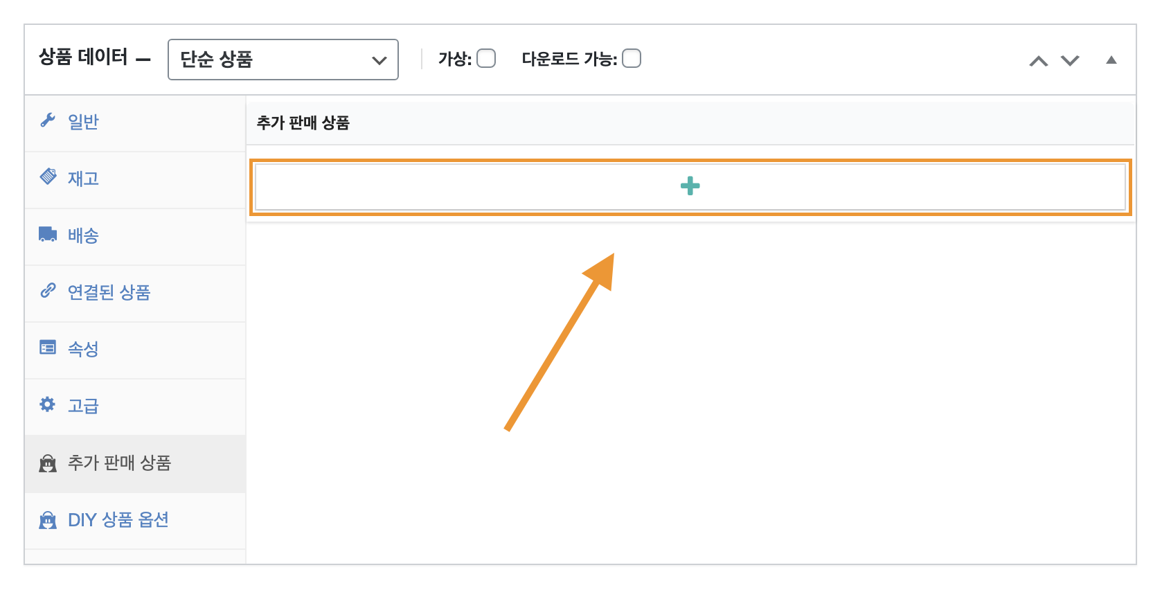 - 단순 상품인 상품에서 추가 판매 상품 탭을 클릭해보시면 아래와 같은 화면이 나타납니다.