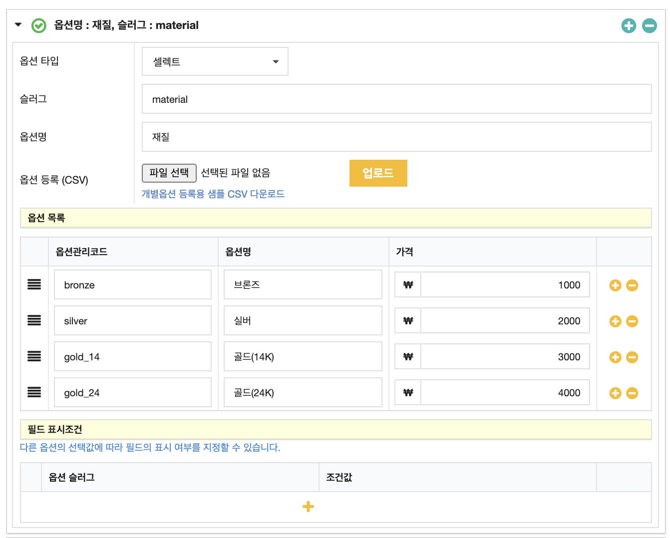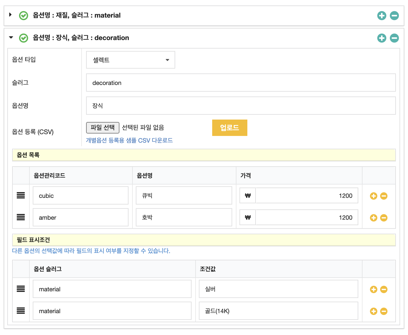 본 매뉴얼에서 재질 옵션 중 실버, 골드(14K)를 선택하면 장식(큐빅, 호박) 옵션이 나타나도록 설정해 보겠습니다.