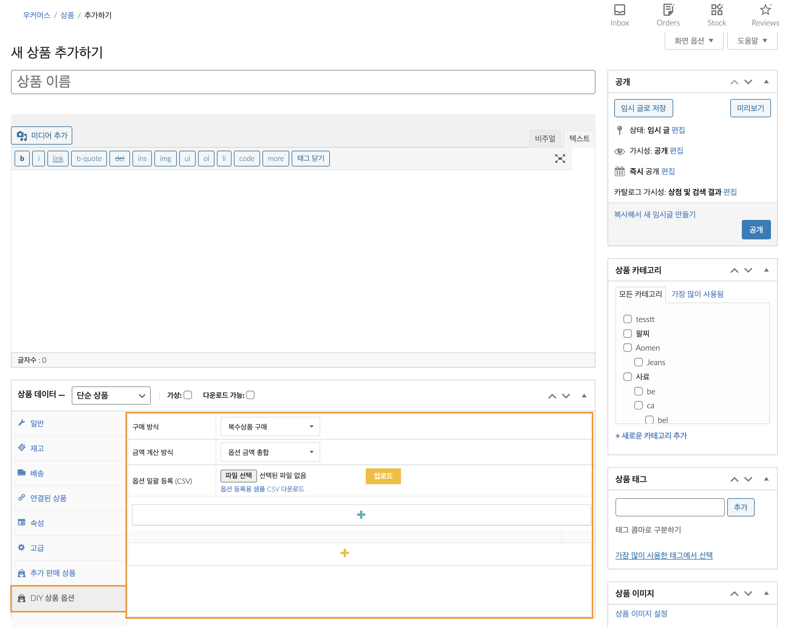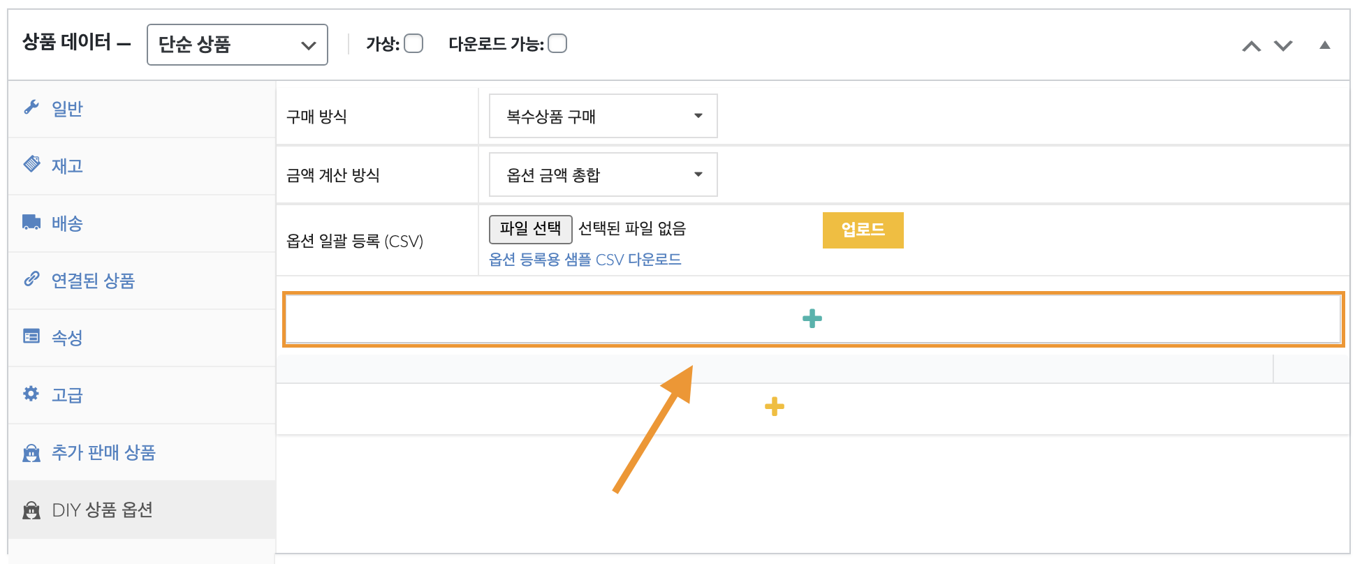 - 단순 상품인 상품에서 DIY 상품 옵션 탭을 클릭해 보시면 아래와 같은 화면이 나타납니다.