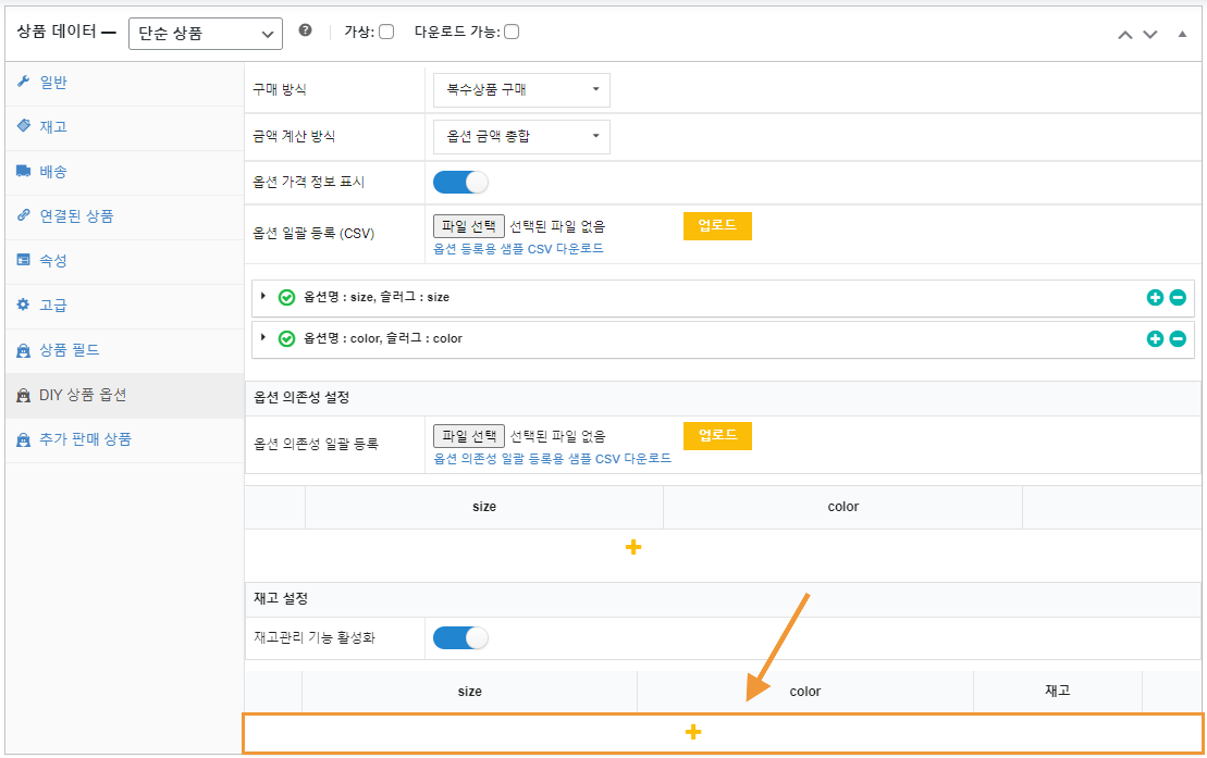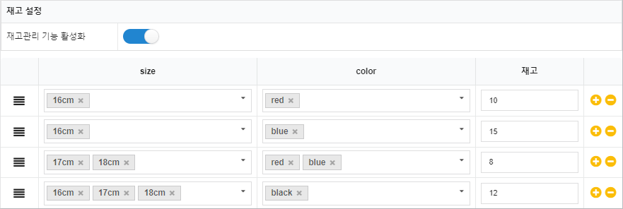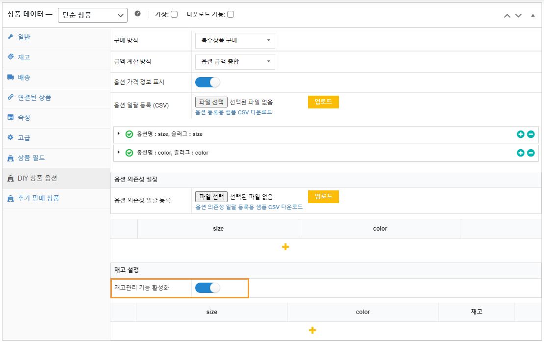 - 생성한 옵션 아래의 재고관리 기능 활성화 옵션을 활성화합니다.