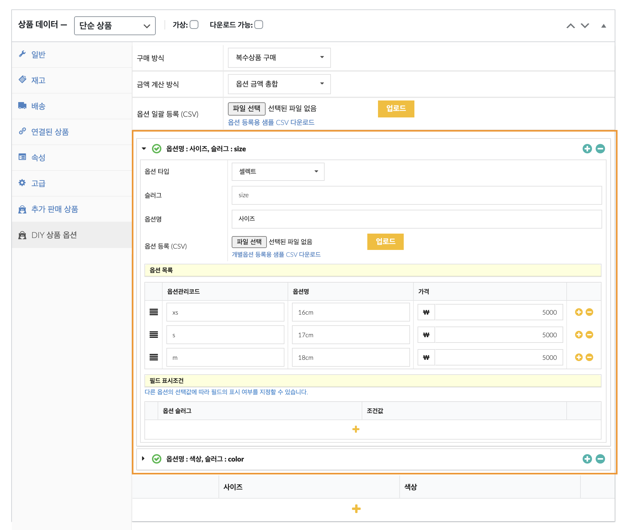 - 단순 상품인 상품에서 DIY 상품 옵션 탭을 클릭해 보시면 아래와 같은 화면이 나타납니다.