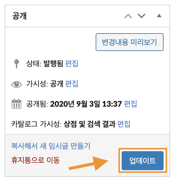- 설정이 끝났으면 업데이트 버튼을 눌러 설정한 값을 저장하시면 상품 상세에서 각 옵션에 재고가 설정된 것을 확인하실 수 있습니다.