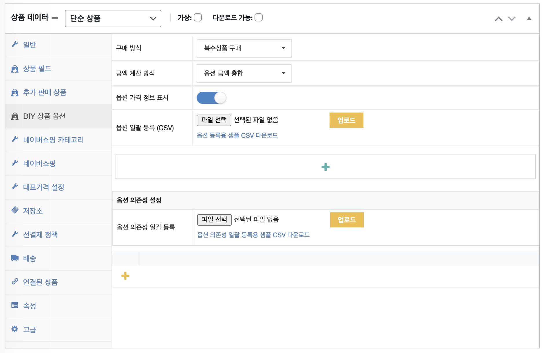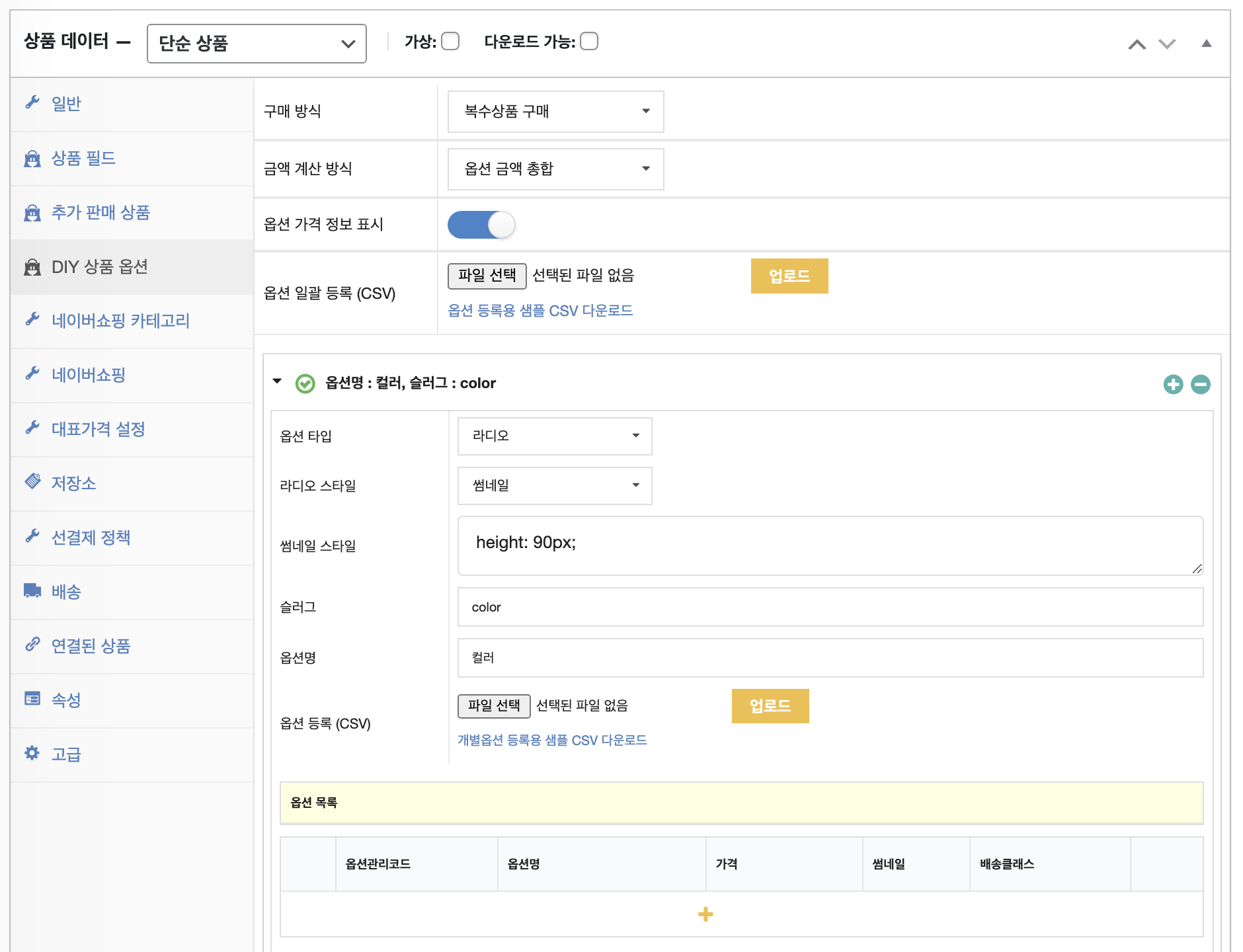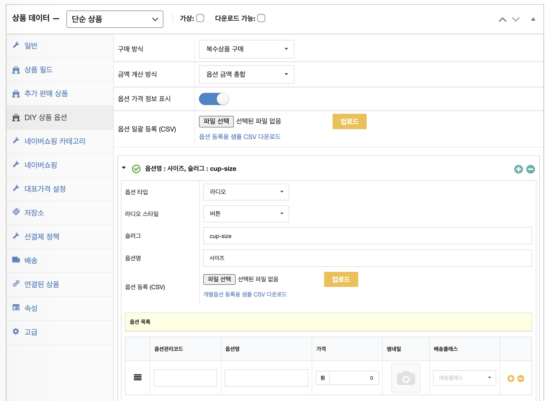 DIY 상품 옵션의 상세 매뉴얼은 DIY 상품 옵션 매뉴얼을 참고해 주시기 바랍니다.