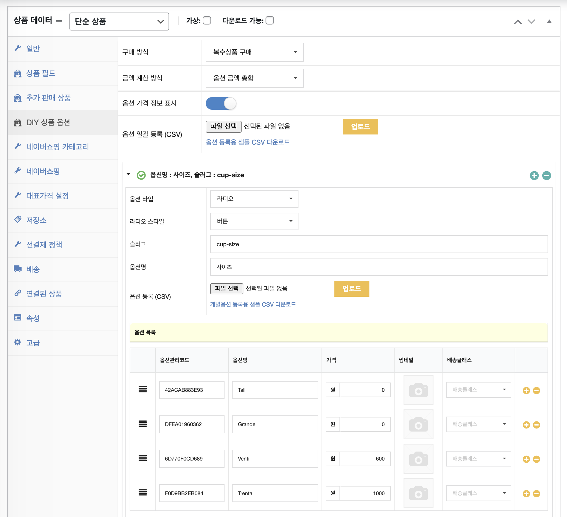 - 옵션 목록에서 플러스 버튼을 클릭하여 옵션관리코드, 옵션명, 가격, 배송클래스를 설정하고 각 옵션의 썸네일을 지정합니다.