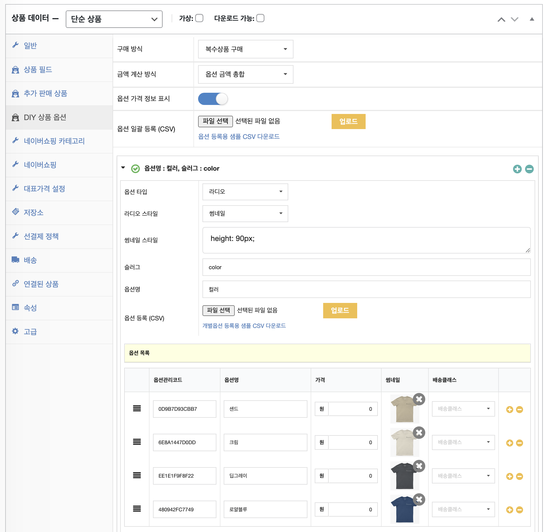 - 옵션 목록에서 플러스 버튼을 클릭하여 옵션관리코드, 옵션명, 가격, 배송클래스를 설정하고 각 옵션의 썸네일을 지정합니다.