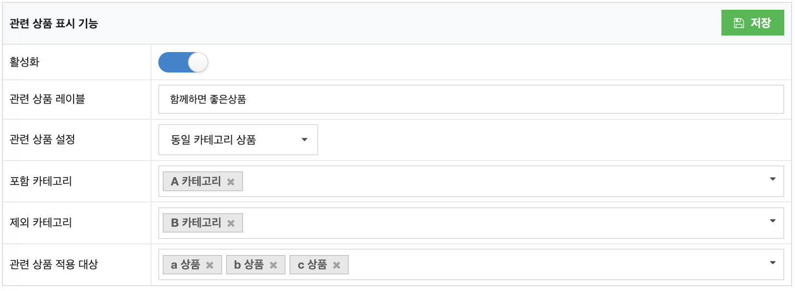 이 때, 제외 카테고리에 B카테고리를 지정할 경우, a상품과 b상품만 나타나며, c상품은 나타나지 않습니다.