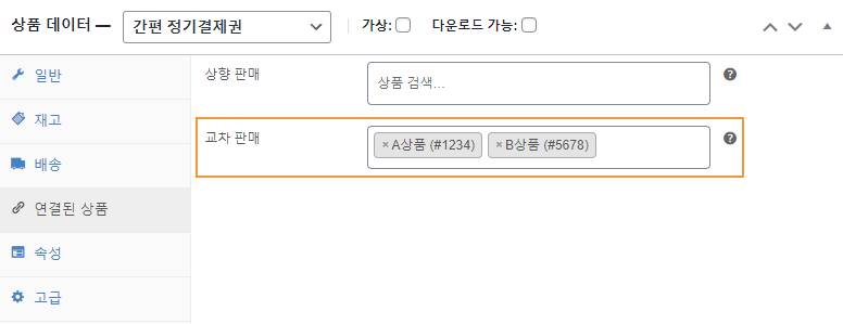 장바구니에 포함된 상품의 편집 페이지 > 연결된 상품 > 교차 판매 옵션에 지정된 상품이 나타납니다.