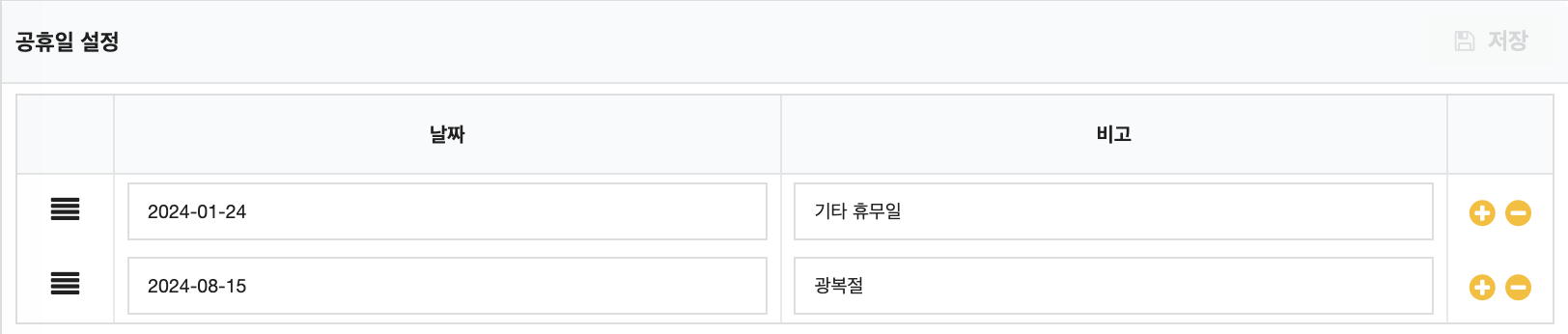 공휴일 날짜를 지정합니다. 날짜는 YYYY-MM-DD 형태로 작성합니다.