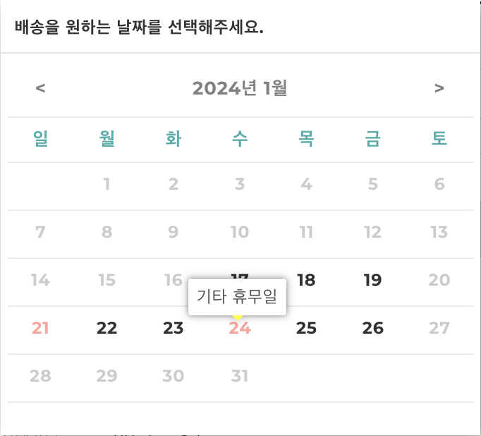 * 해당 설정은 배송일자 선택 기능을 위한 설정입니다. 고객은 공휴일(설정된 날짜)을 배송일로 지정할 수 없습니다. (참고) 배송 요청일 지정 상품 만들기