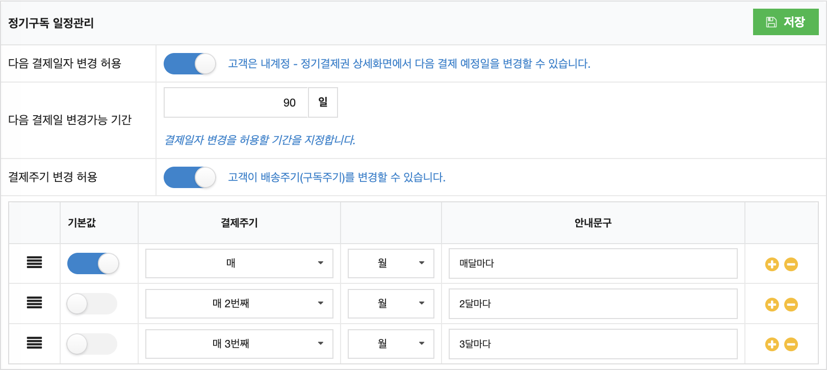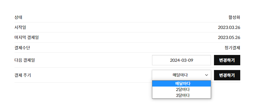 결제주기를 지정합니다. 이미지와 같이 설정할 경우, 고객은 결제주기를 매월/매2번째월/매3번째월 중 선택하여 변경할 수 있습니다.