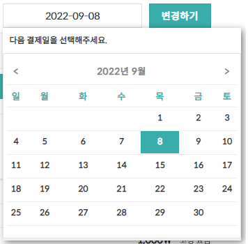 고객이 구독 상품 구매 시 내 계정 > 구독 상세 정보에서 결제일 변경 버튼 및 결제 주기 버튼을 클릭하여 다음 결제일 또는 결제 주기를 변경할 수 있습니다.