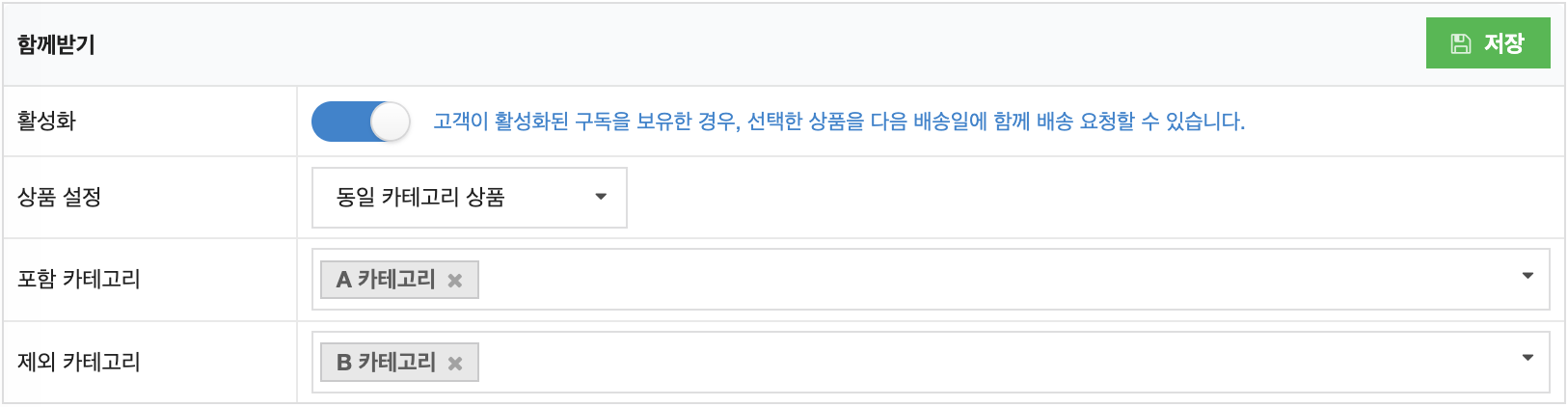 ex. 현재 구독 중인 상품이 ⓐ상품입니다. ⓐ상품은 A카테고리, B카테고리가 지정되어 있습니다. ⓑ상품도 마찬가지로 A카테고리, B카테고리가 지정되어 있습니다. ⓒ상품은 B카테고리만 지정되어 있습니다. 이 때, 제외 카테고리에 B카테고리를 지정할 경우, ⓐ상품과 ⓑ상품만 나타나며, ⓒ상품은 나타나지 않습니다.