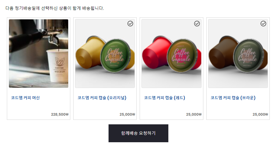 상품을 선택한 후 함께 배송 요청 시, 해당 상품이 다음 배송일(갱신 시)에 결제 및 배송됩니다.