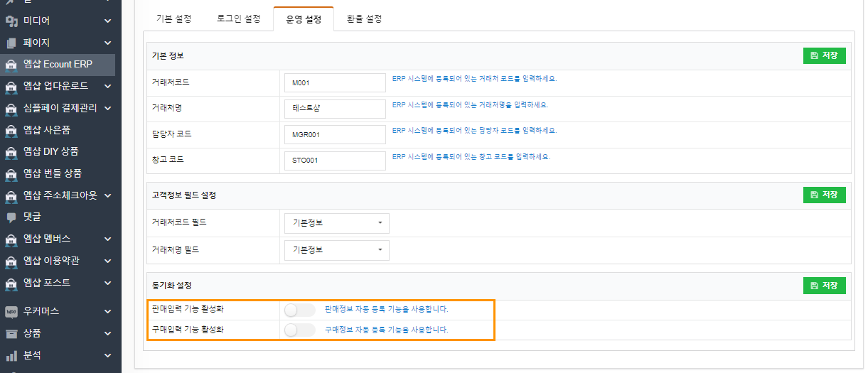 만약, 자동 연동은 사용하지 않고 수동 연동만 사용하시려면 “엠샵 Ecount ERP” 메뉴의 “운영설정” 탭으로 이동하신 후, “동기화 설정” 섹션에서 “판매입력 기능”과 “구매입력 기능”을 모두 비활성화 해주세요.