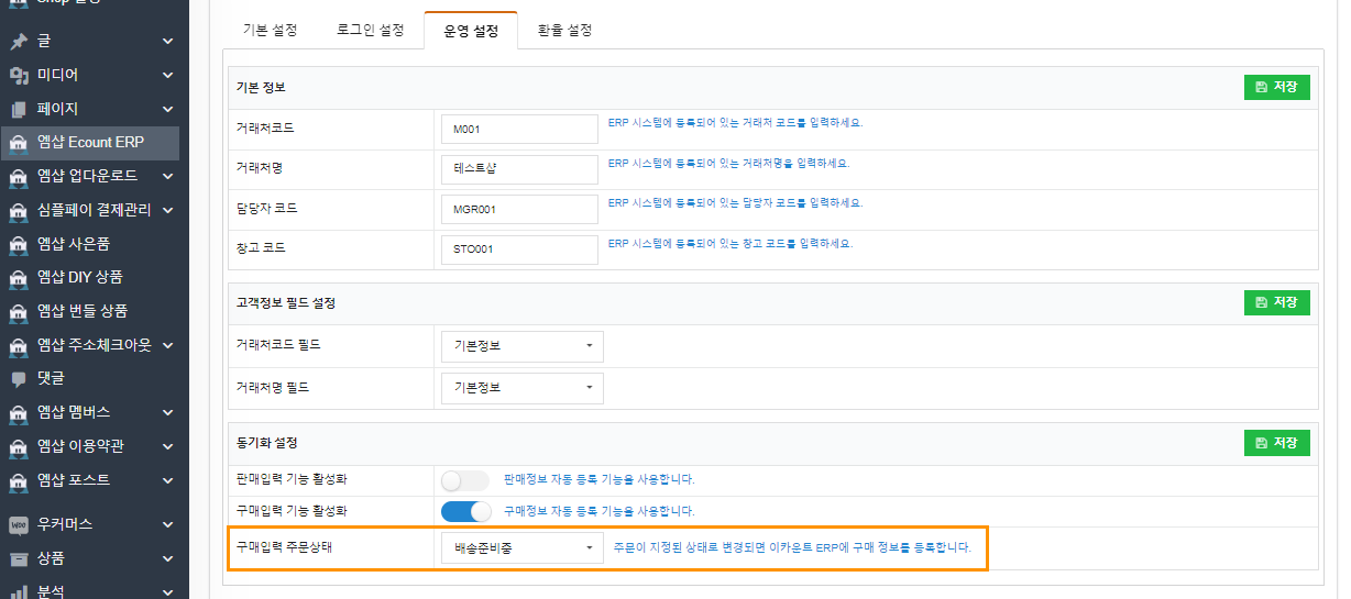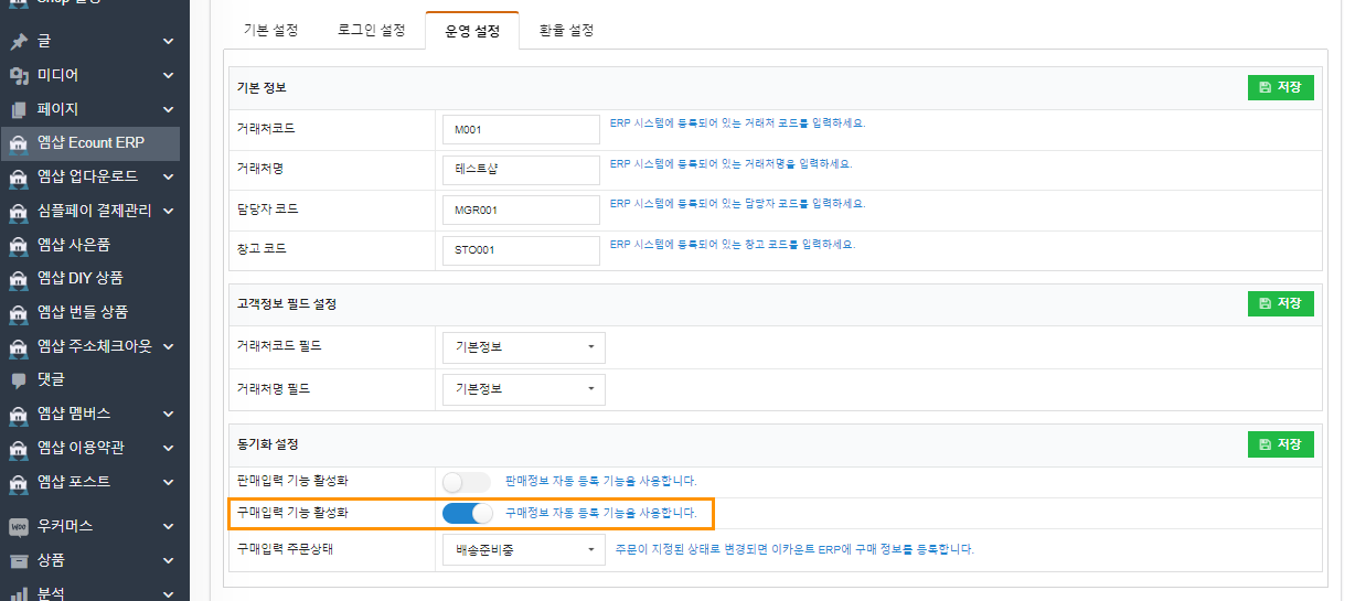 고객의 주문 정보를 Ecount ERP 시스템의 구매정보와 자동으로 연동하시려면, 구매입력 동기화 기능을 활성화 해주셔야 합니다. “엠샵 Ecount ERP” 메뉴의 “운영설정” 탭으로 이동하신 후, “동기화 설정” 섹션에서 “구매입력 기능”을 활성화 합니다.