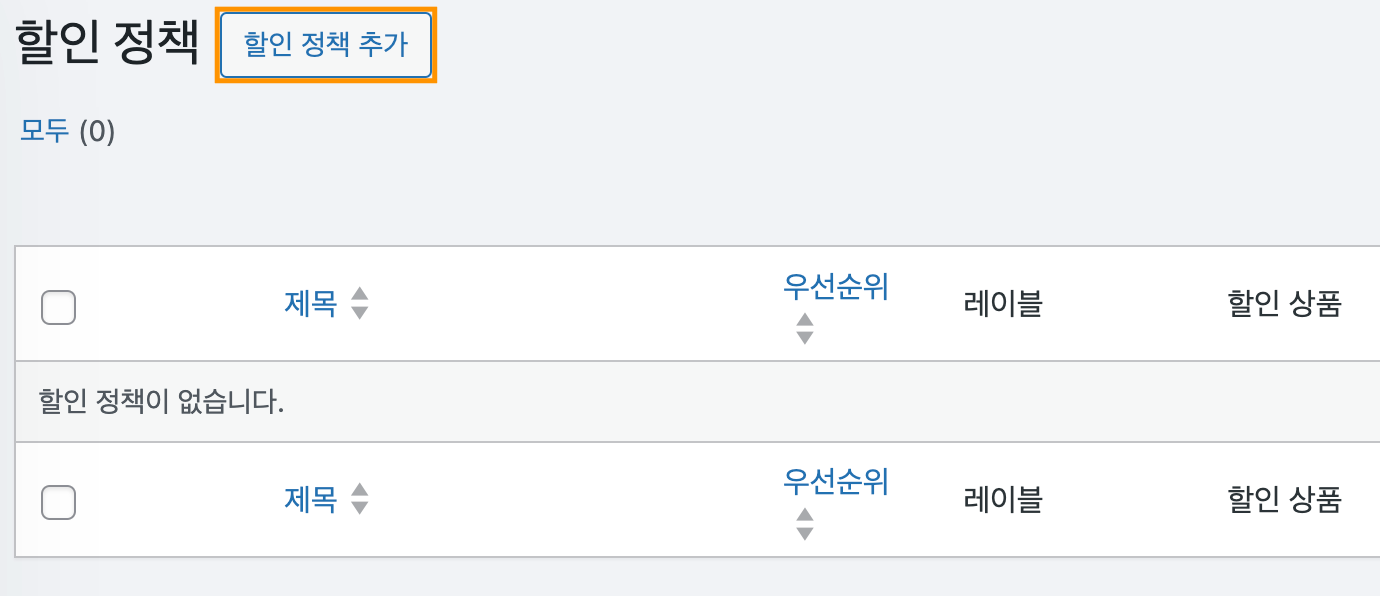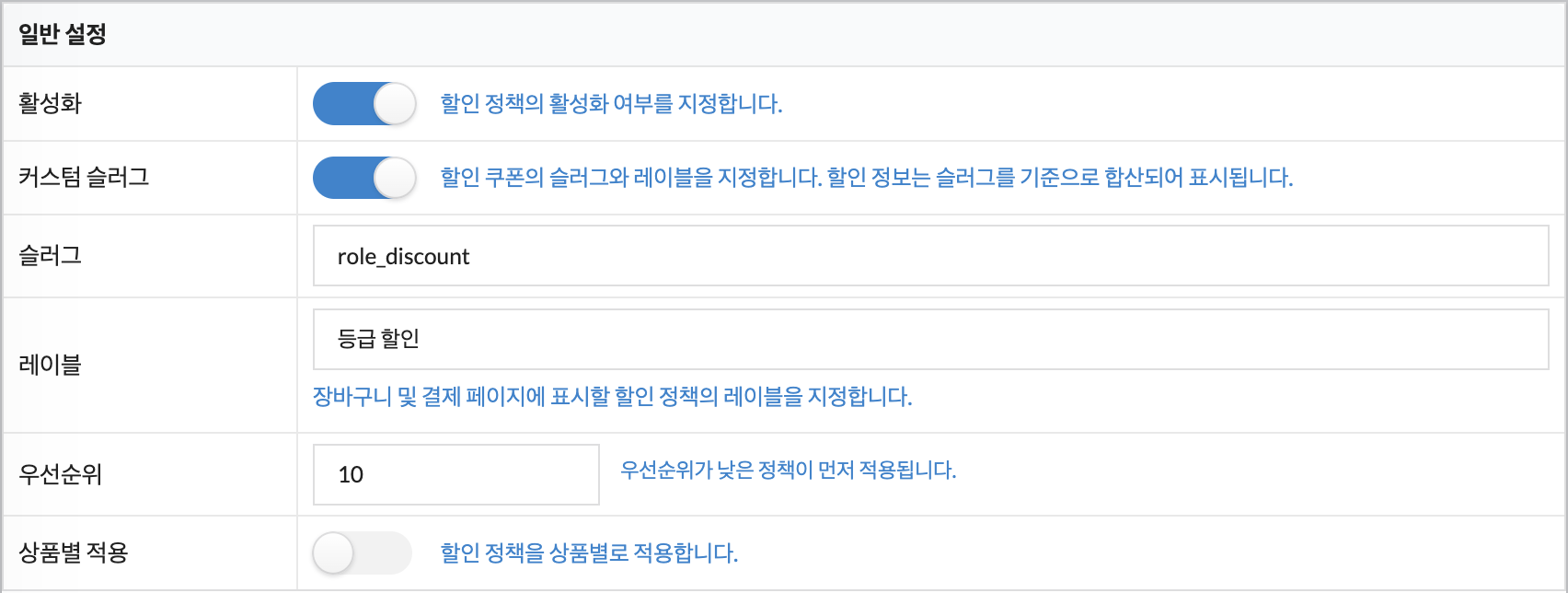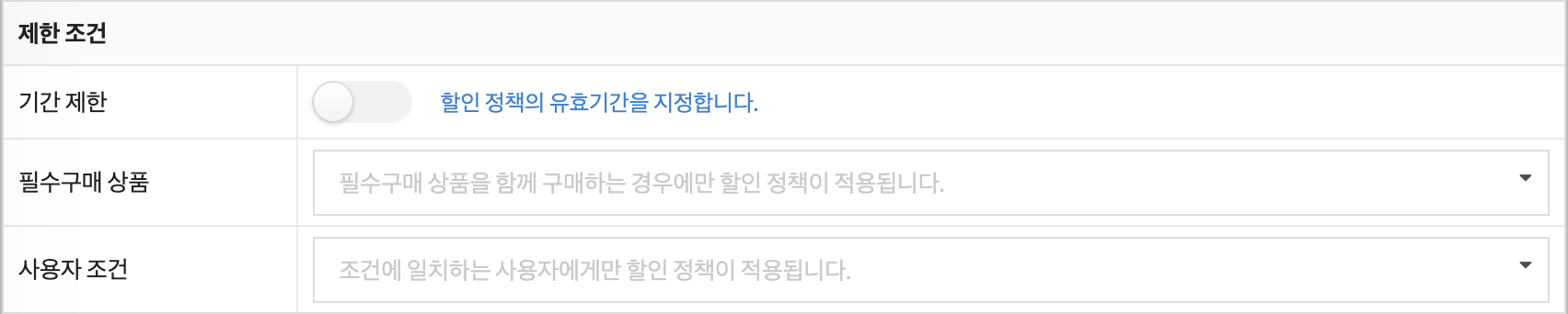 정책의 유효 기간이나 적용을 위해 필수적으로 구매해야 하는 상품, 혹은 특정 조건을 달성한 사용자들에게만 할인이 적용되도록 설정하실 수 있습니다.