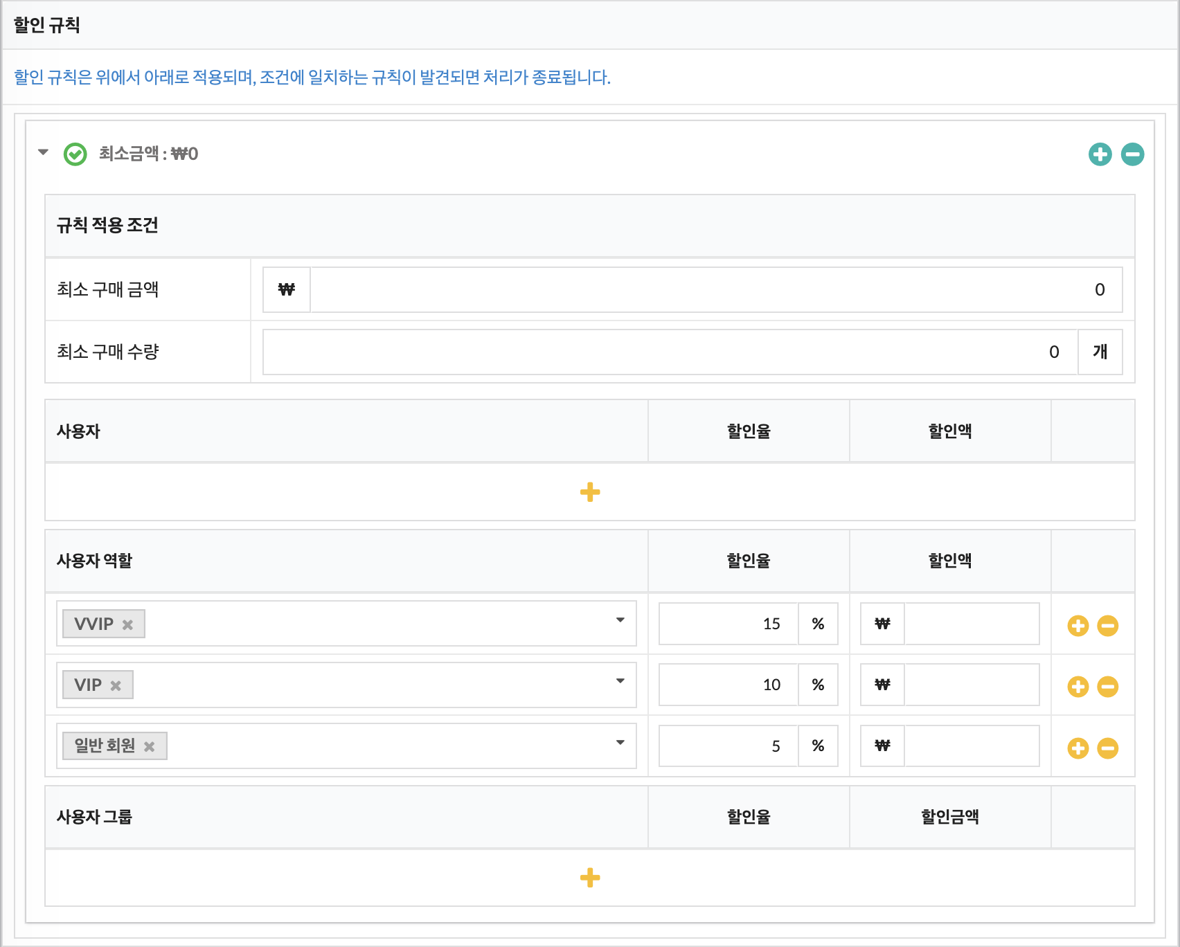 이 외에도 사용자를 직접 지정하거나, 사용자 그룹을 지정하여 할인을 적용할 수 있습니다.