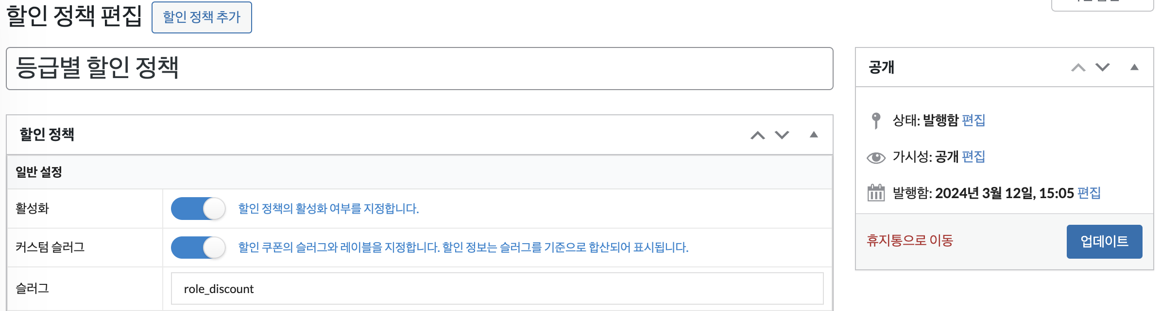 정책을 원하시는 내용에 맞춰 설정하셨다면, 우측 상단 공개 메타박스 영역에서 업데이트를 눌러 정책을 저장하실 수 있습니다.