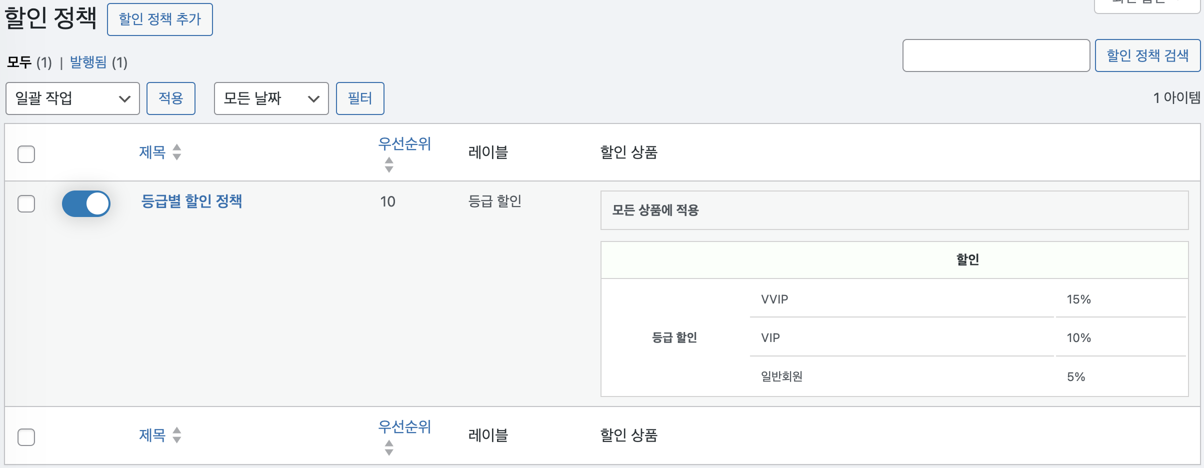정책을 설정하셨다면 [엠샵 멤버쉽 > 할인 정책]에서 설정한 정책을 확인해보실 수 있습니다.
