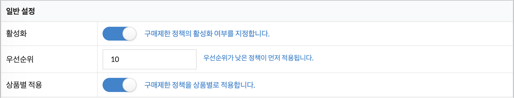 좌측의 활성화 버튼을 통해 정책의 현재 활성화 상태를 확인하실 수 있으며, 클릭하여 활성화/비활성화를 조절하실 수도 있습니다.