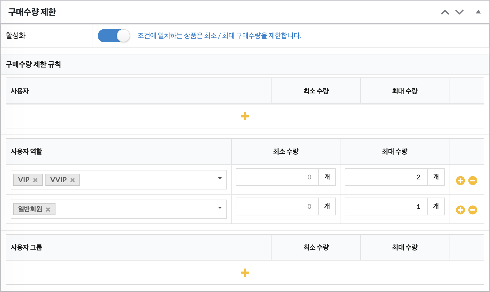 본 매뉴얼은 특정 상품에 대한 구매 가능한 개수를 적용하는 방법을 다루고 있습니다.