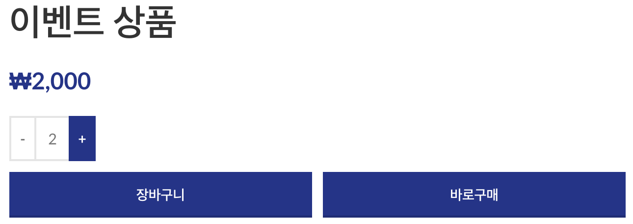 위에서 상품별 적용 옵션을 활성화 하였기에 특별 이벤트 카테고리에 포함된 상품을 각각 최대 1개, 2개씩 구매할 수 있습니다.