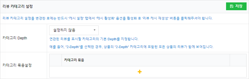 지정한 Depth에 포함된 카테고리의 상품들은 리뷰를 서로 공유합니다.(참고) Depth 란 카테고리의 단계와 비슷합니다. * 예시 메인 카테고리 : 상의 (1-Depth) 상의의 하위 카테고리 : 티셔츠 (2-Depth) 티셔츠의 하위 카테고리 : 반팔 (3-Depth)