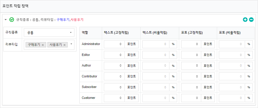 텍스트만 존재하는 리뷰나 사진이 포함된 리뷰에 대해 각각 적립할 포인트를 지정합니다.
