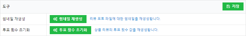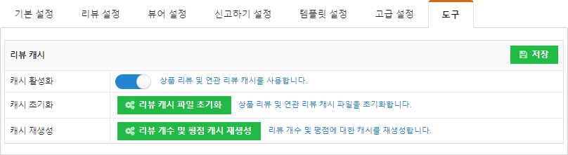 리뷰 개수 및 평점에 대한 캐시를 재생성합니다. (주의) 리뷰 카테고리 설정을 하셨다면, 반드시 캐시 재생성 버튼을 클릭하여 캐시를 재생성해 주셔야 합니다.